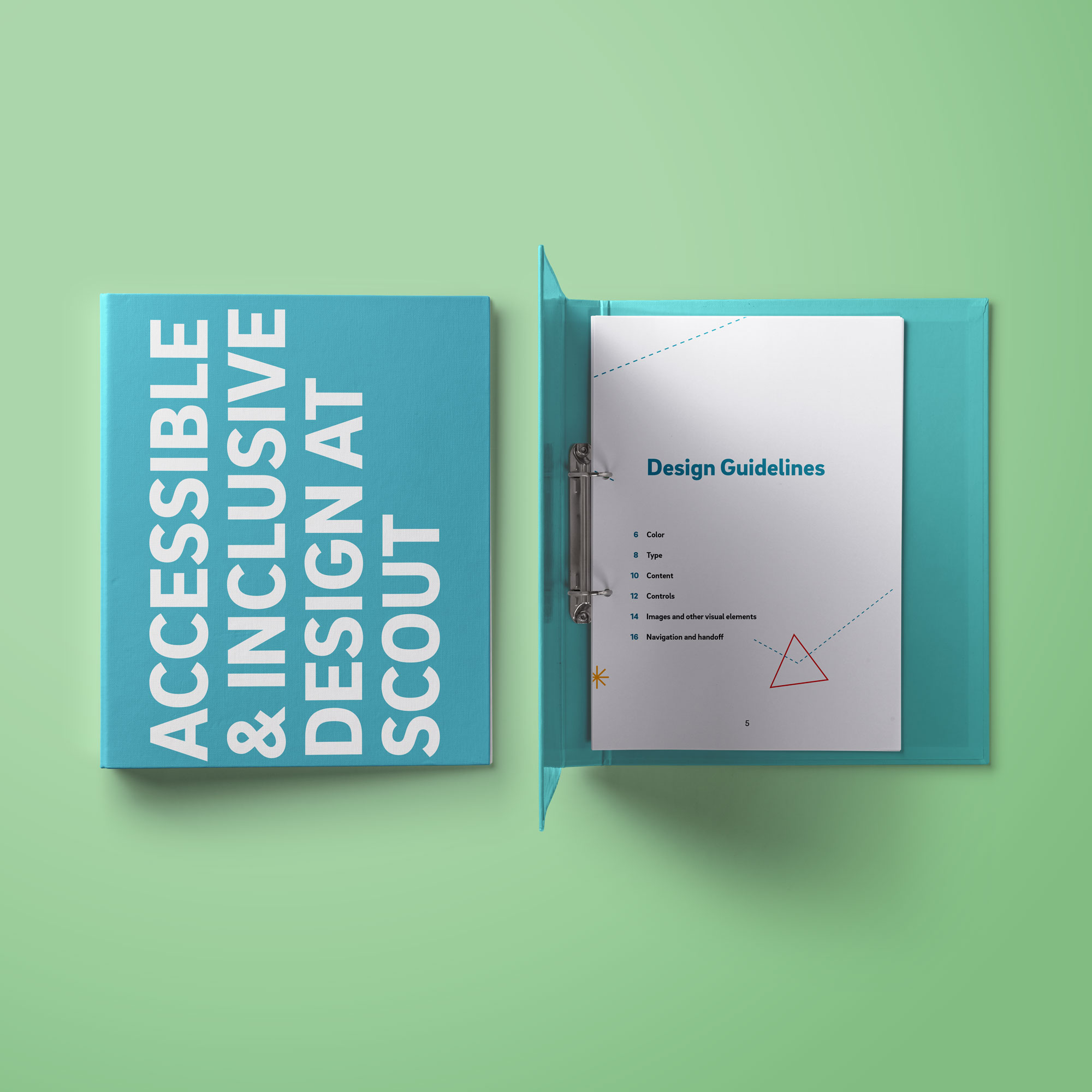 In the spring of 2022 I worked with a team on an internal project for Scout, Northeastern University's design organization. Together we researched and compiled a standardized set of accessibility guidelines for designers and developers, then strategized and executed different ways of ensuring that these guidelines are implemented. My job on the team was to design a book that explained these guidelines with examples. I decided that the format for this document should be a binder, to allow future Scout members to edit and add to the document as our understanding of accessible design deepens.